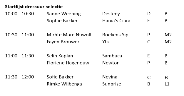 De ruiters mogen zich opgeven voor de selectie in beide disciplines, springen en/of dressuur. Ook mag je een voorkeur uitspreken voor de instructie waarvan je les zou willen hebben. De ruiters die zich hebben aangemeld, worden uitgenodigd om op een selectie-dag “voor te rijden”. De ruiters worden beoordeeld door deskundige selecteurs . Alle deelnemers krijgen persoonlijk bericht of ze wel of niet geselecteerd zijn voor de lessen, of dat ze op de reservelijst staan.